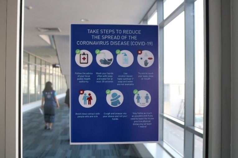 Once the passengers get off the plane, there are posters in the terminal to remind passengers on taking steps to protect themselves to reduce the spread of COVID-19.