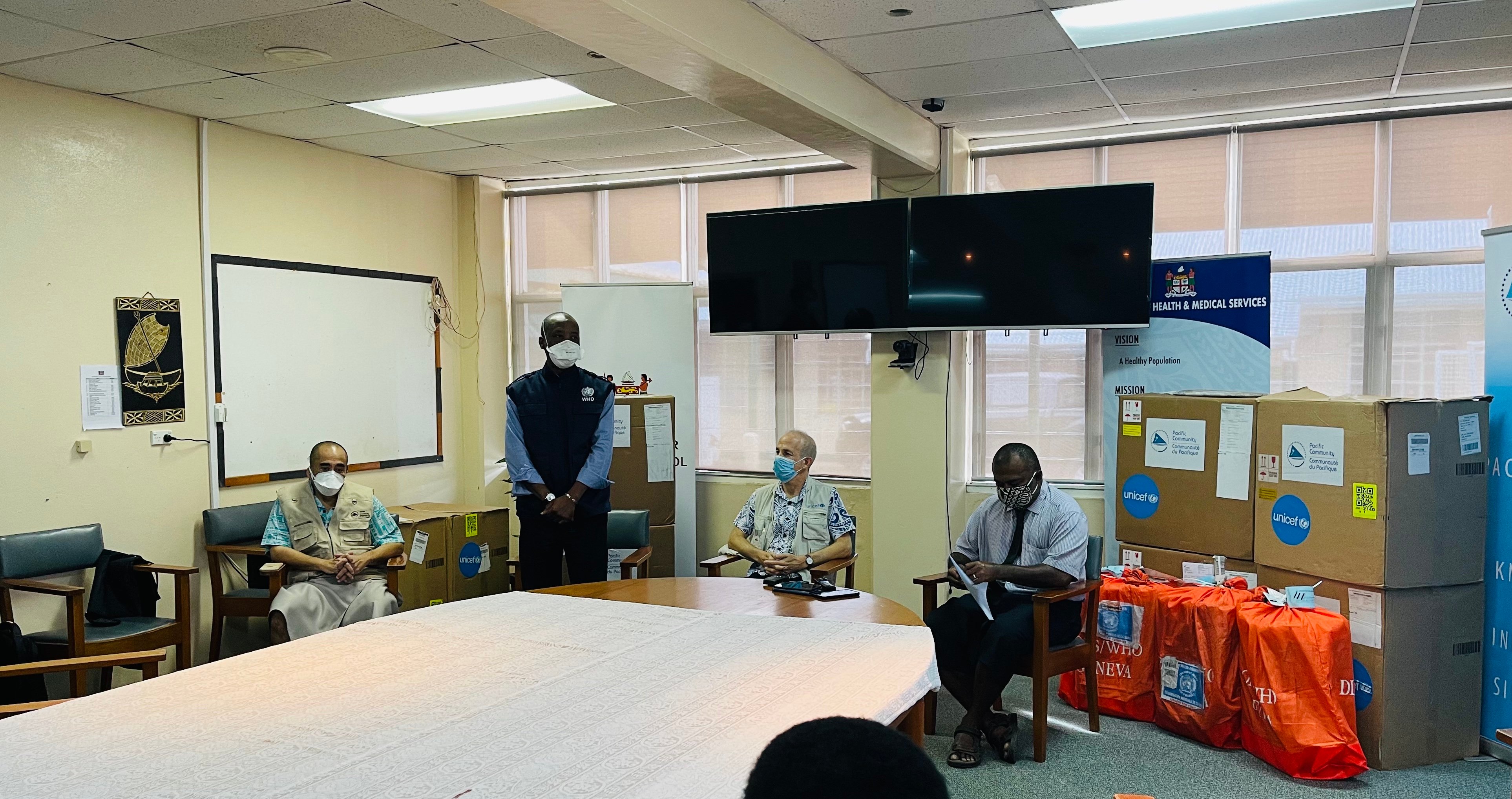 Dr Waqainabete, accompanied by Dr Akeem Ali, Acting Representative of WHO in the South Pacific, Mr. Sheldon Yett, Representative of UNICEF in the Pacific, and Mr. Sunia Soakai, Deputy Director of the Public Health Division of the Pacific Community, also thanked the team of doctors and nurses working tirelessly at the CDC to ensure that testing is done in a timely manner.